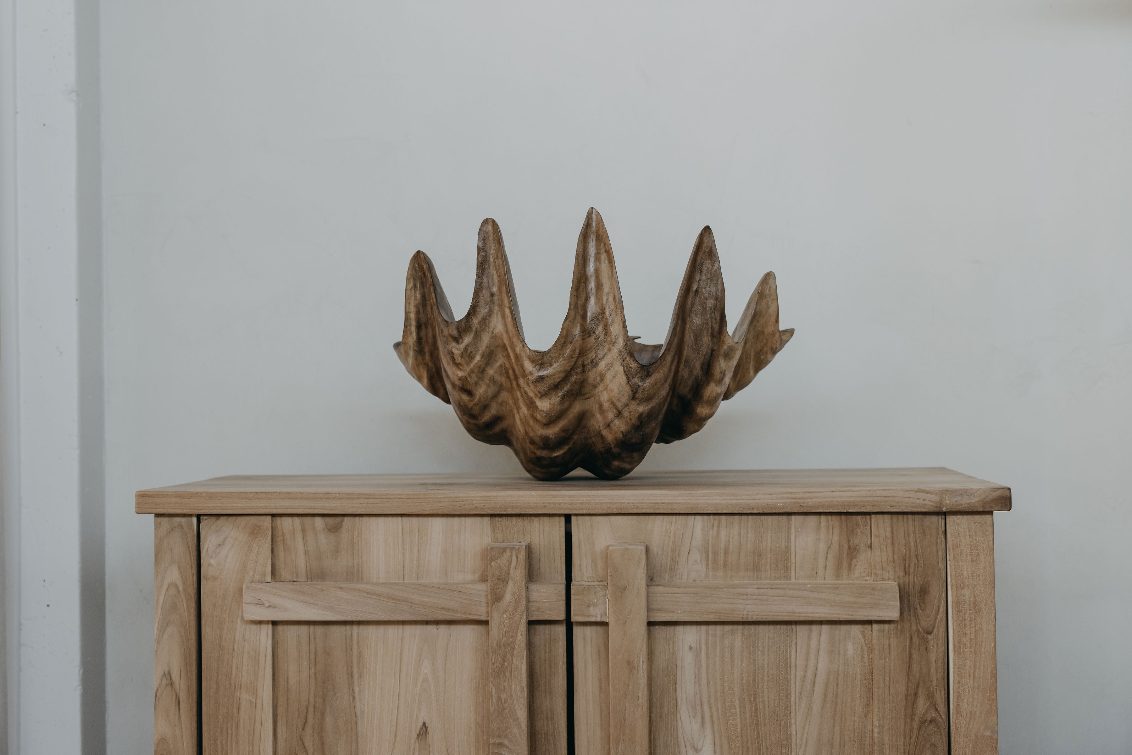 A handcarved oversized clam shell made from Suar wood is a striking piece of craftsmanship, designed to evoke the natural beauty of the sea while showcasing the skilled artistry of wood carving. The shell's intricate details capture the soft, flowing lines of a clam, with exaggerated curves and grooves that mimic the natural texture of its surface. The Suar wood, known for its rich, deep tones and grain patterns, adds warmth and a sense of organic beauty to the piece. Its large scale gives it a dramatic presence, making it a unique focal point in any space. The smooth finish highlights the wood's natural luster, while the carving's fine detailing offers a sense of movement and depth, making it an impressive work of art that celebrates both nature and craftsmanship.